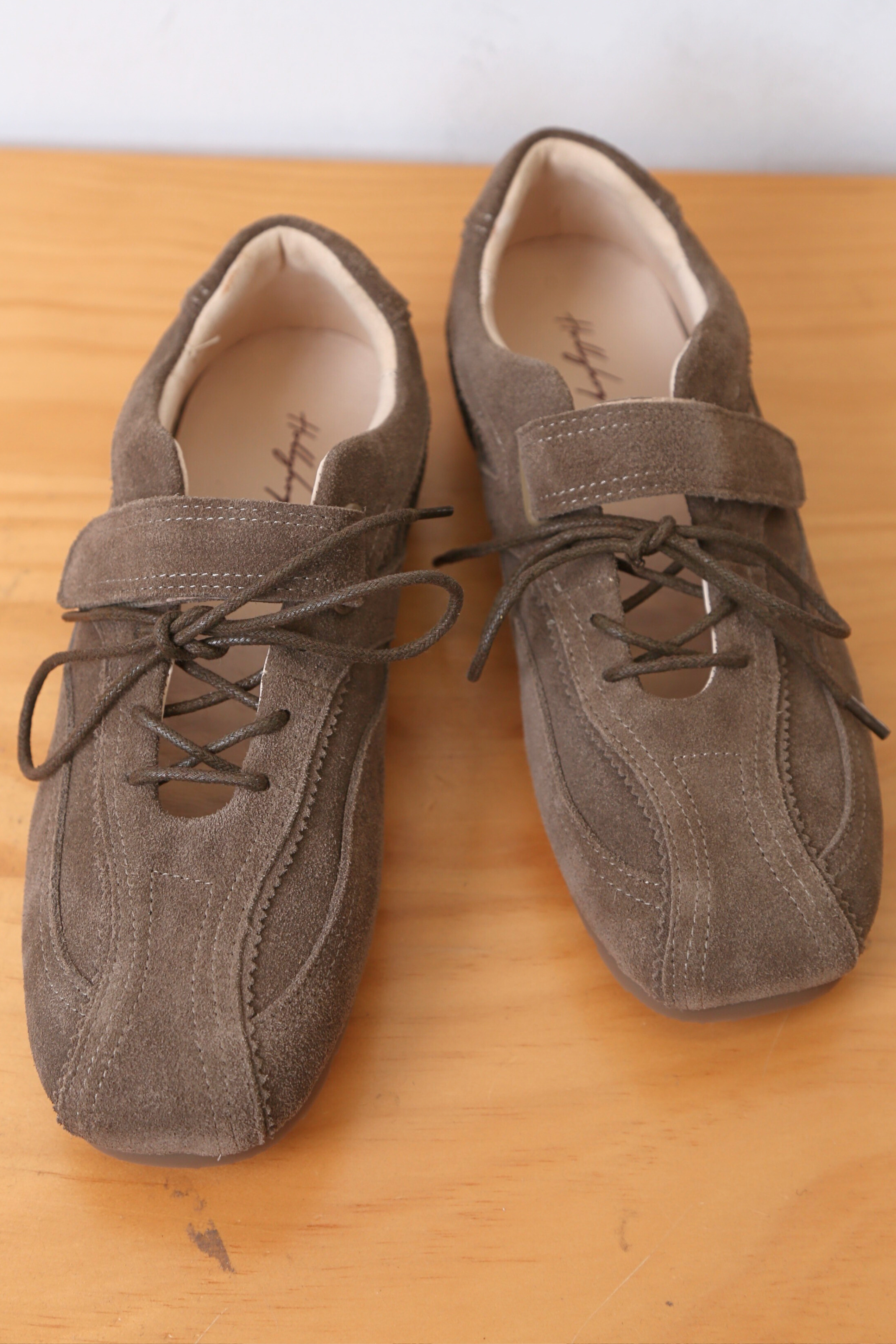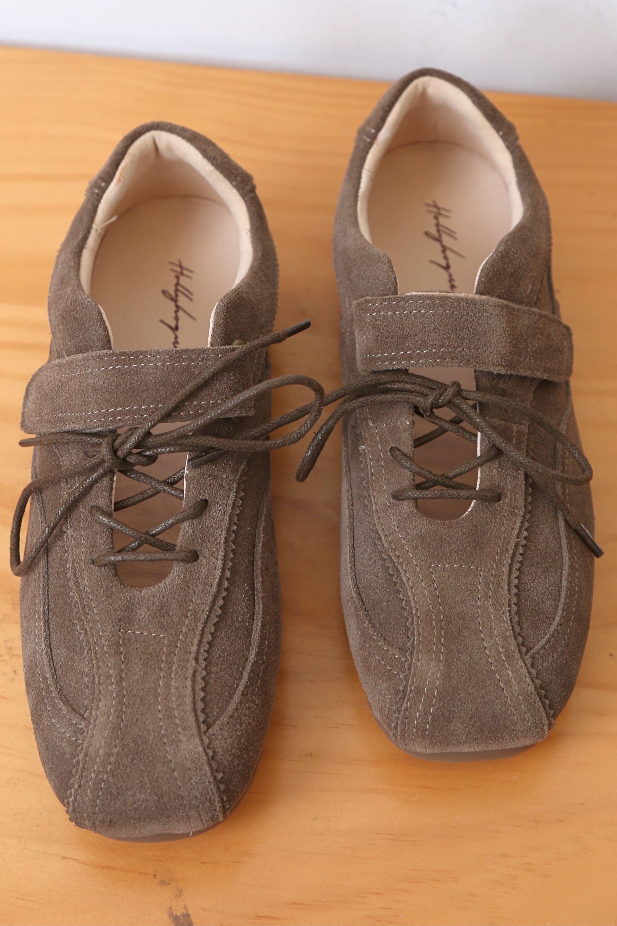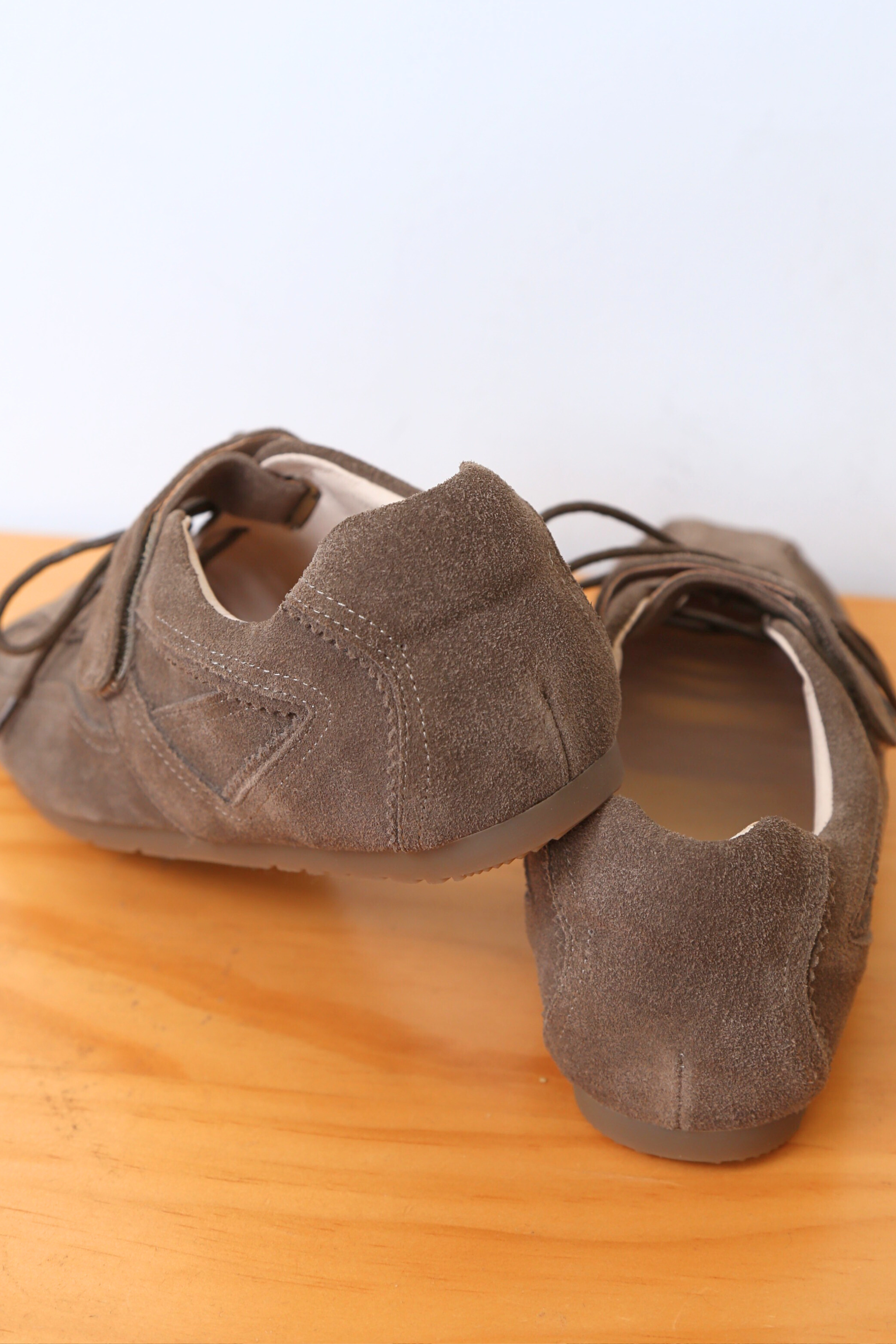 A chic fusion of ballet-inspired elegance and everyday comfort. Crafted from supple nubuck leather, these sneakers offer a soft, matte finish that adds a refined touch to any outfit. Designed with both lace-up and velcro front closures, they provide a secure, customisable fit while keeping the look clean and minimal.