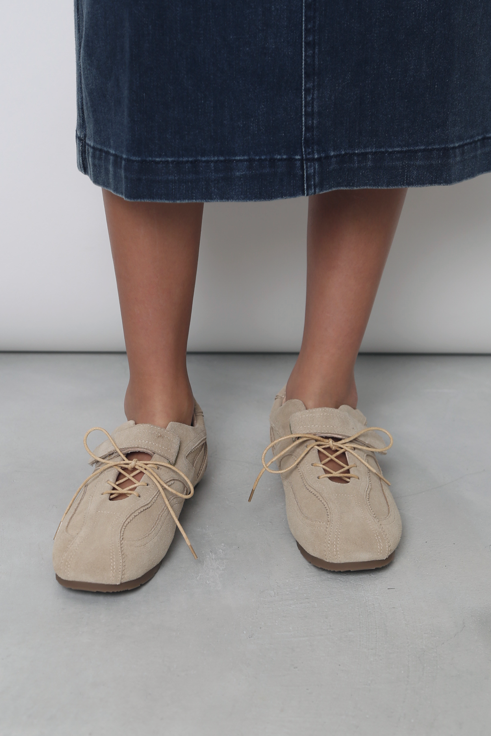 A chic fusion of ballet-inspired elegance and everyday comfort. Crafted from supple nubuck leather, these sneakers offer a soft, matte finish that adds a refined touch to any outfit. Designed with both lace-up and velcro front closures, they provide a secure, customisable fit while keeping the look clean and minimal.