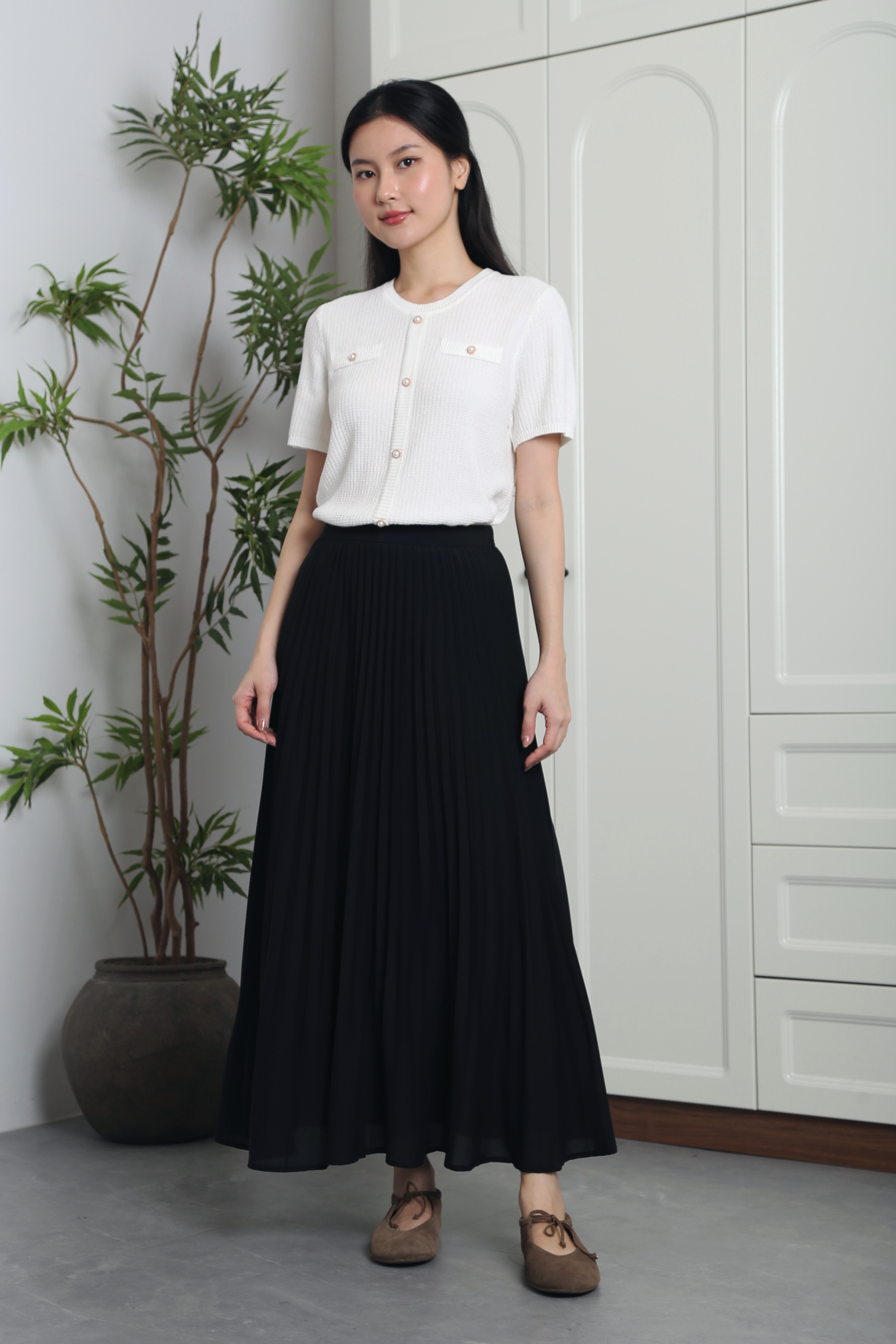 The Bellagio Classy Knit Blouse is crafted from a soft cotton-polyester woven knit, offering comfort and structure in one. Elegant pearl button details add a touch of sophistication, while the timeless design makes it perfect for both workdays and casual outings. Pair it with tailored trousers or skirts for a polished, versatile look.