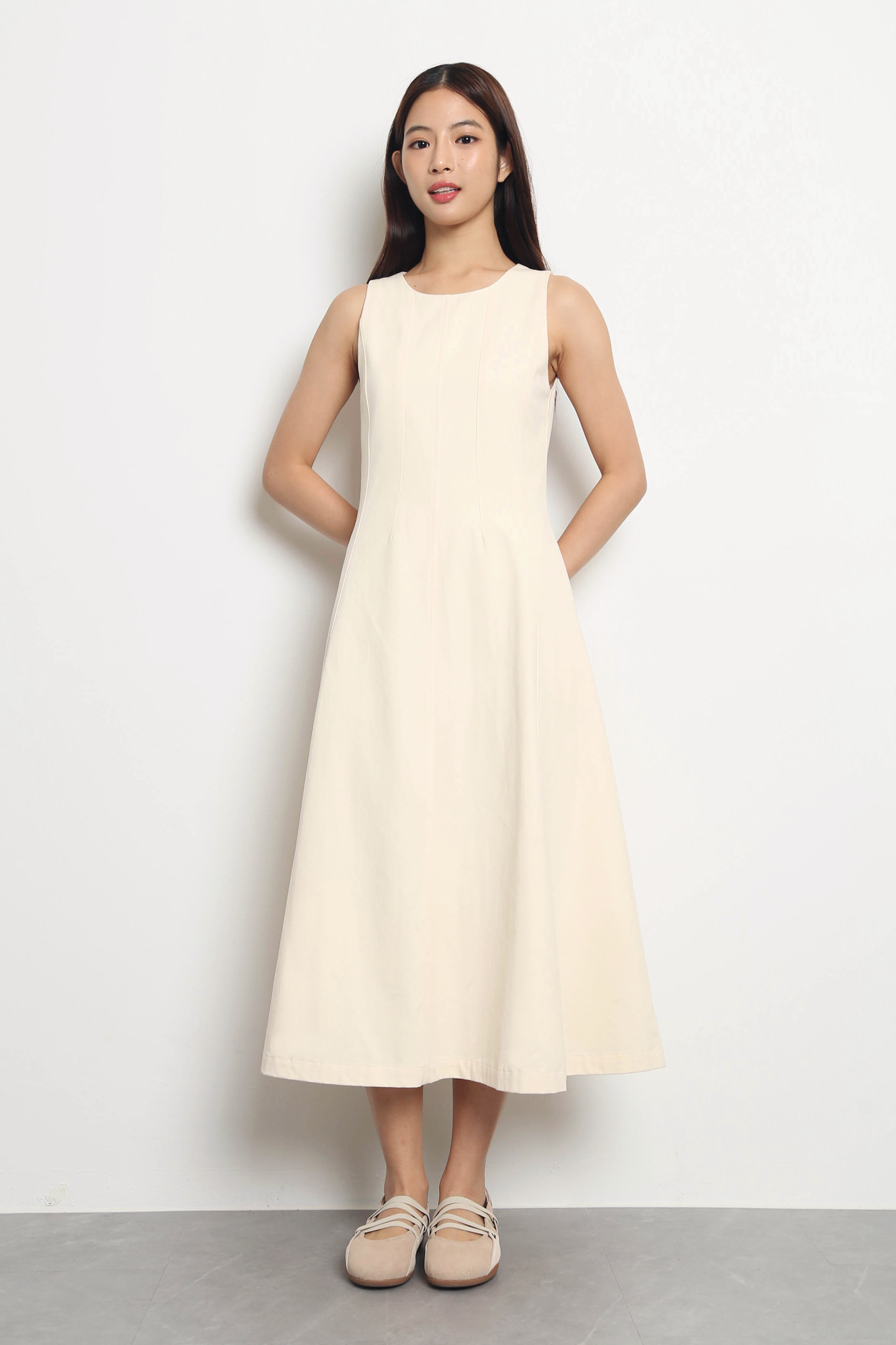 A refined midaxi dress with soft panel detailing that creates a graceful, elongated silhouette. Crafted from a semi-structured cotton blend and fully lined for comfort, it features a concealed back zipper and functional side pockets. Perfect for casual days out, brunch dates, weekend gatherings, or even a relaxed office setting—effortless elegance for any day.