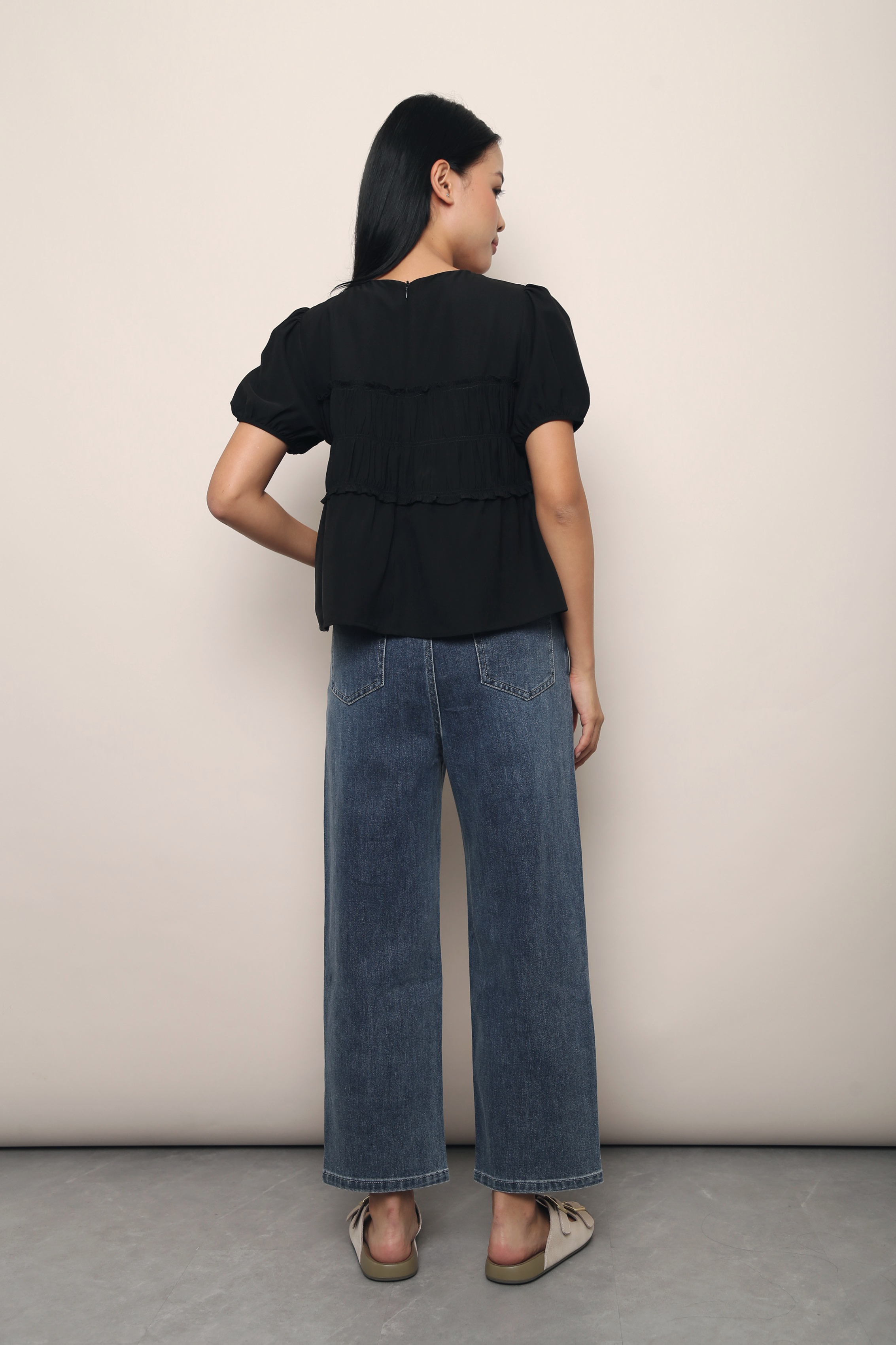 A softly structured babydoll top with delicate ruched detailing, a flattering V-neckline and gentle puff sleeves, creating an effortless feminine silhouette. Crafted from lightweight, fully lined polyester crepe with a concealed back zipper, it’s perfect for brunches, workdays, café dates or casual evenings out. Pair it with tailored trousers or a midi skirt for a polished look, or style it with denim for an easy everyday outfit.