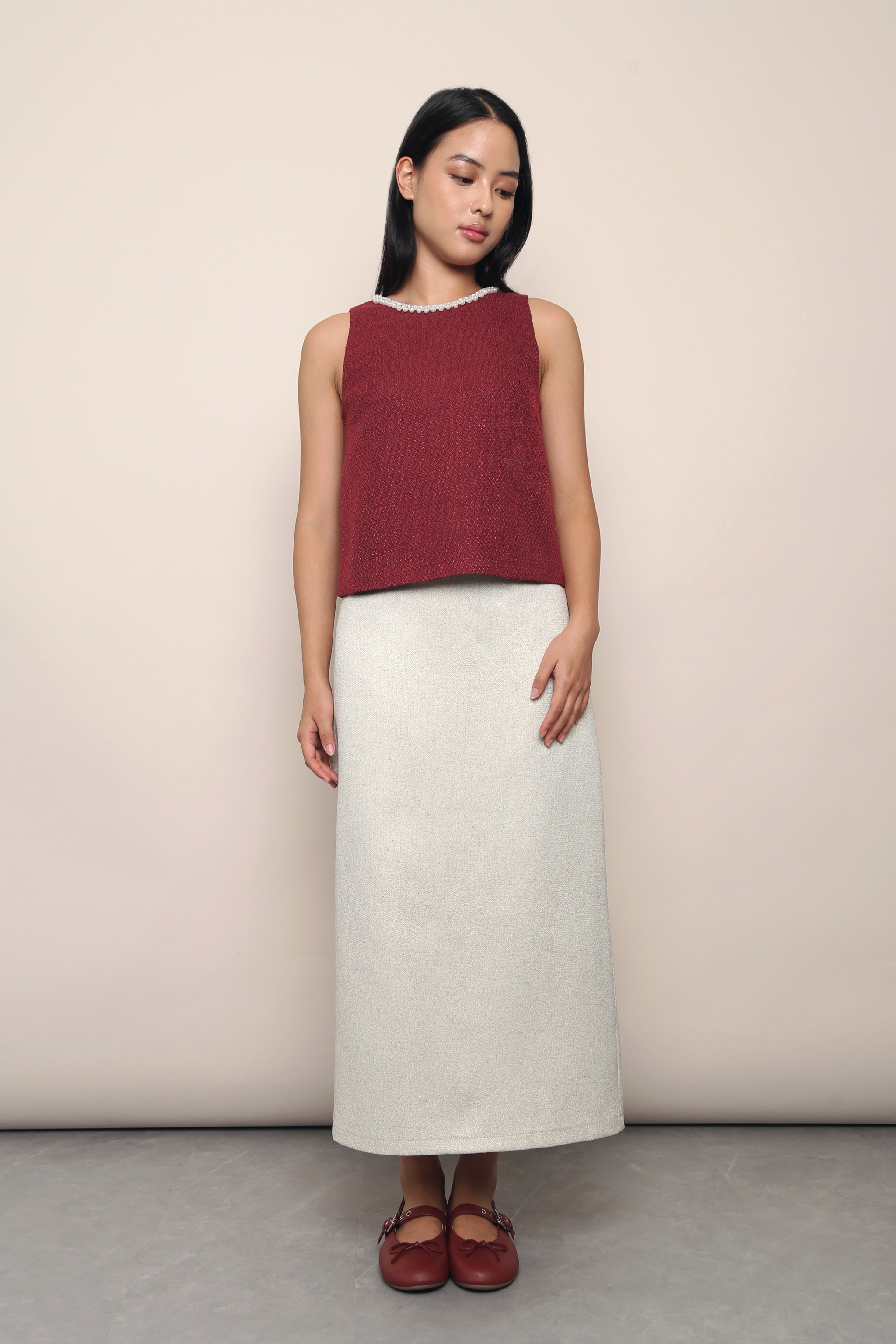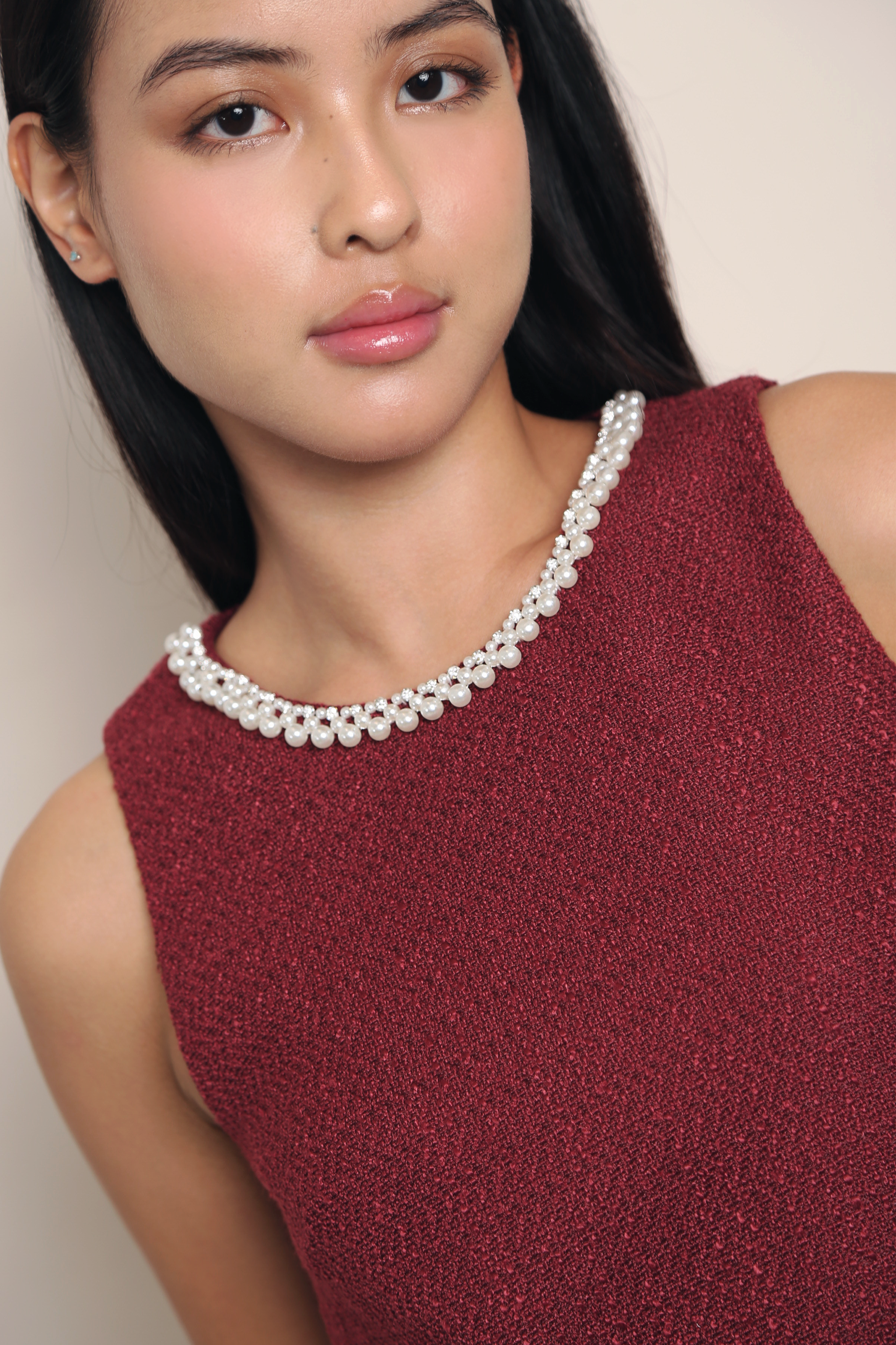 A chic statement piece designed to elevate any look. Crafted from lightweight tweed and fully lined for comfort, this vest top features a beautifully embellished pearl neckline that adds a touch of refined glamour. Perfect for pairing with tailored bottoms or skirts for a classy, sophisticated finish.