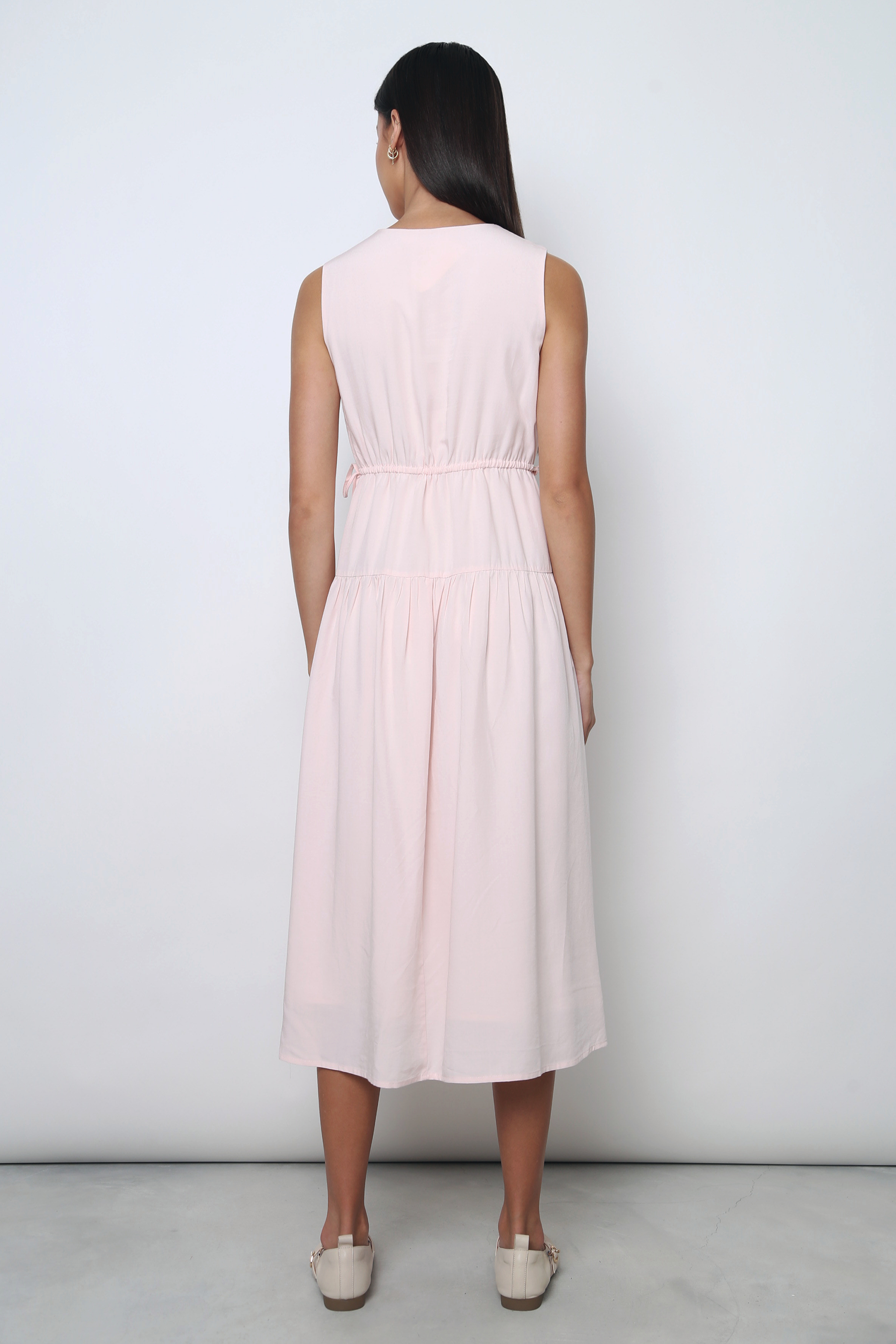 A lightweight, sleeveless midi dress with a graceful, flowing silhouette. It features a soft V-neckline and a cinched waist detail, often secured by a tie, that helps define the figure before the skirt drops into a comfortable, tiered length. This effortless piece is perfect for casual datime events, picnics, resort wear, or comfortable travel outfits.