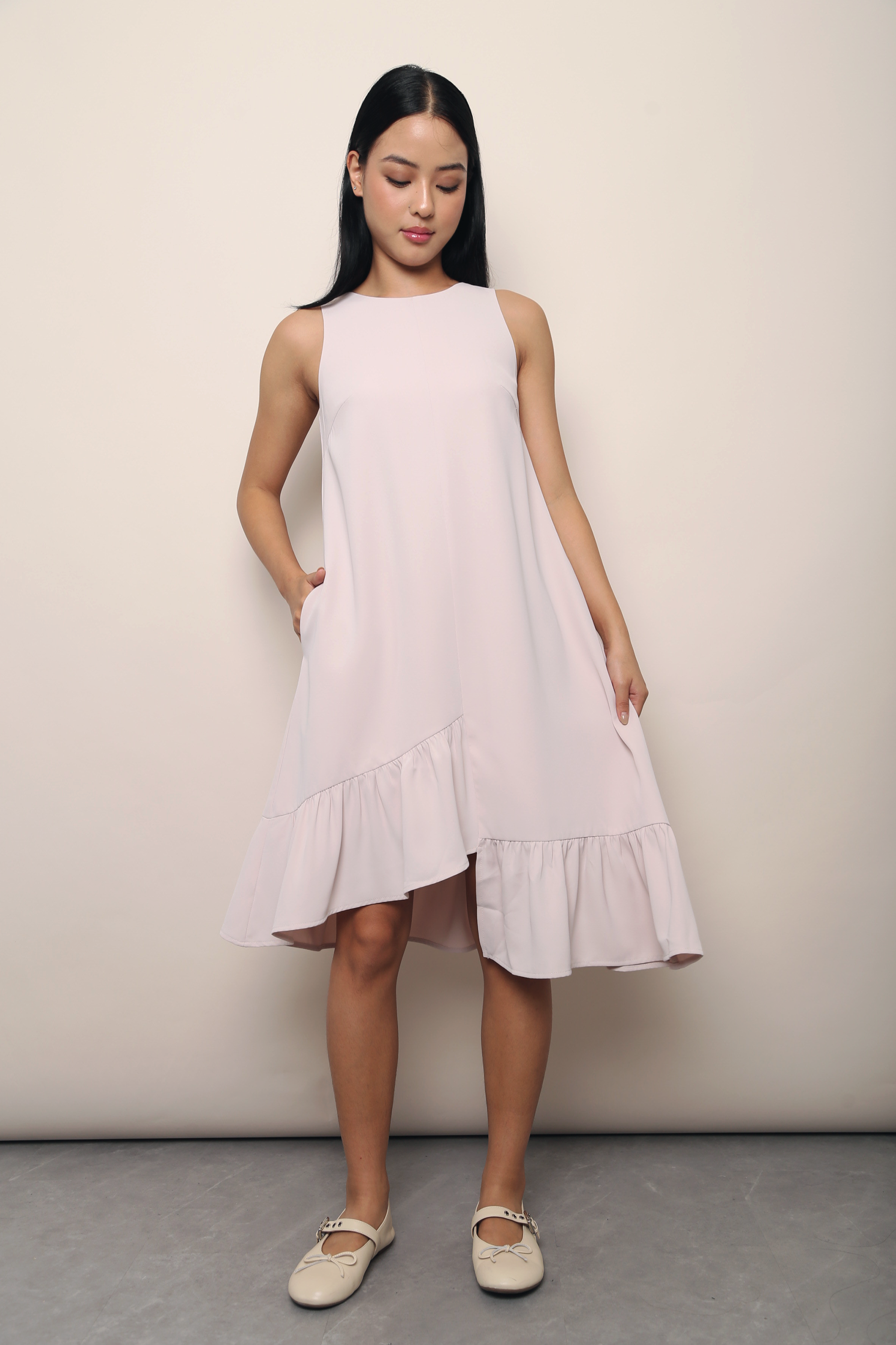Elegant and minimal sleeveless dress with a classic boat neckline and a relaxed straight silhouette. Finished with a soft ruffle hem for a subtle feminine touch. The neutral beige tone makes it easy to dress up or down — perfect for work, casual outings, or layered looks.