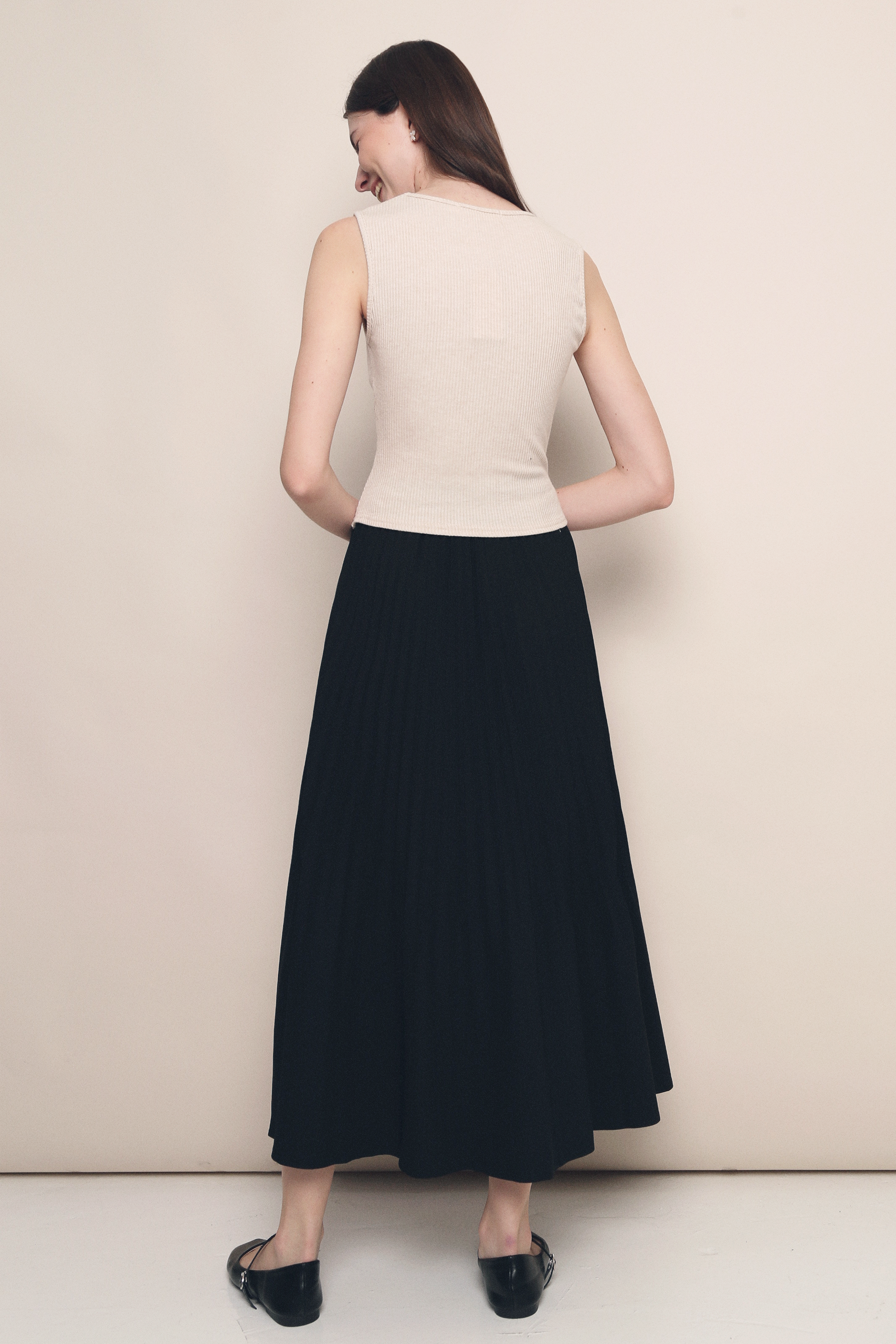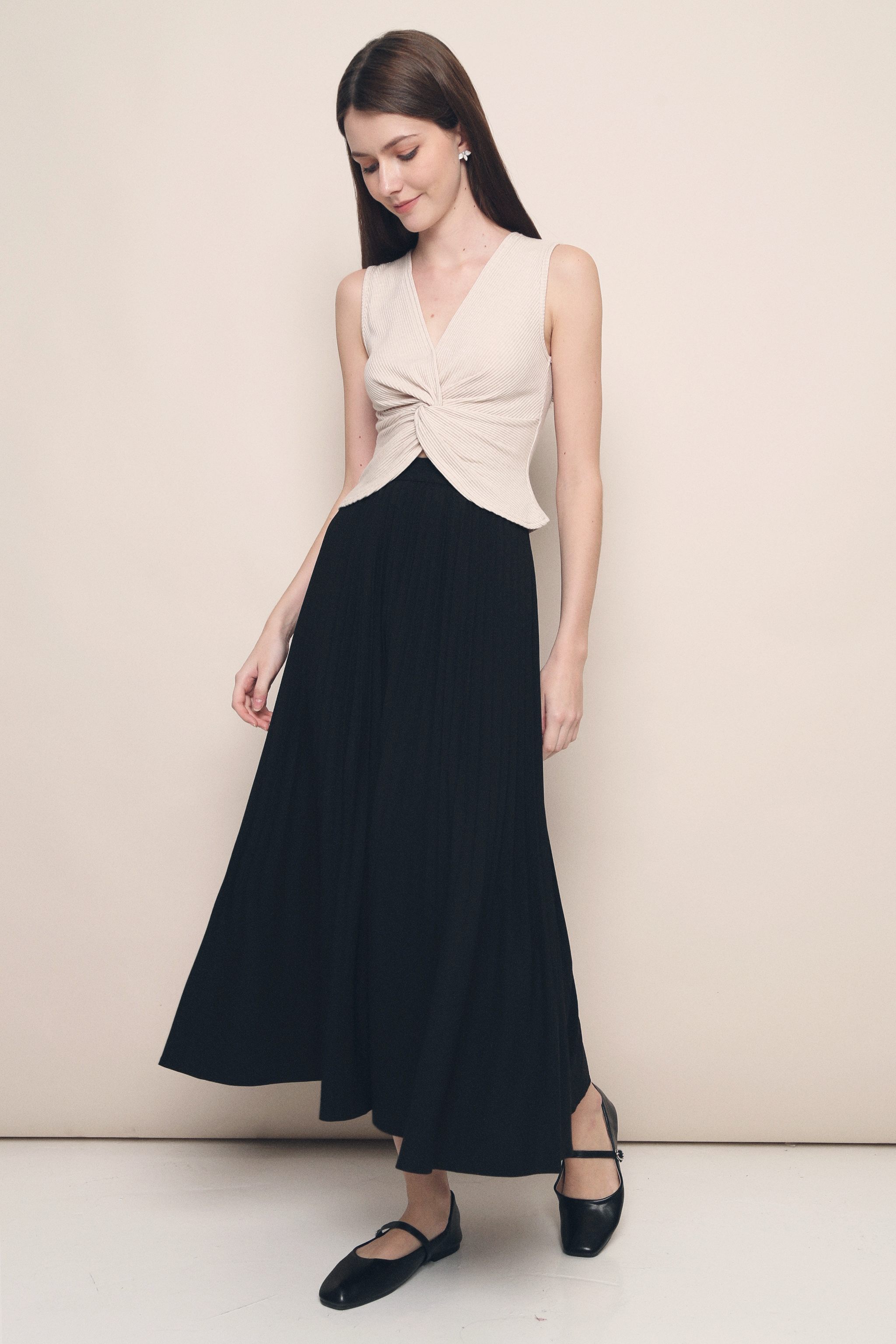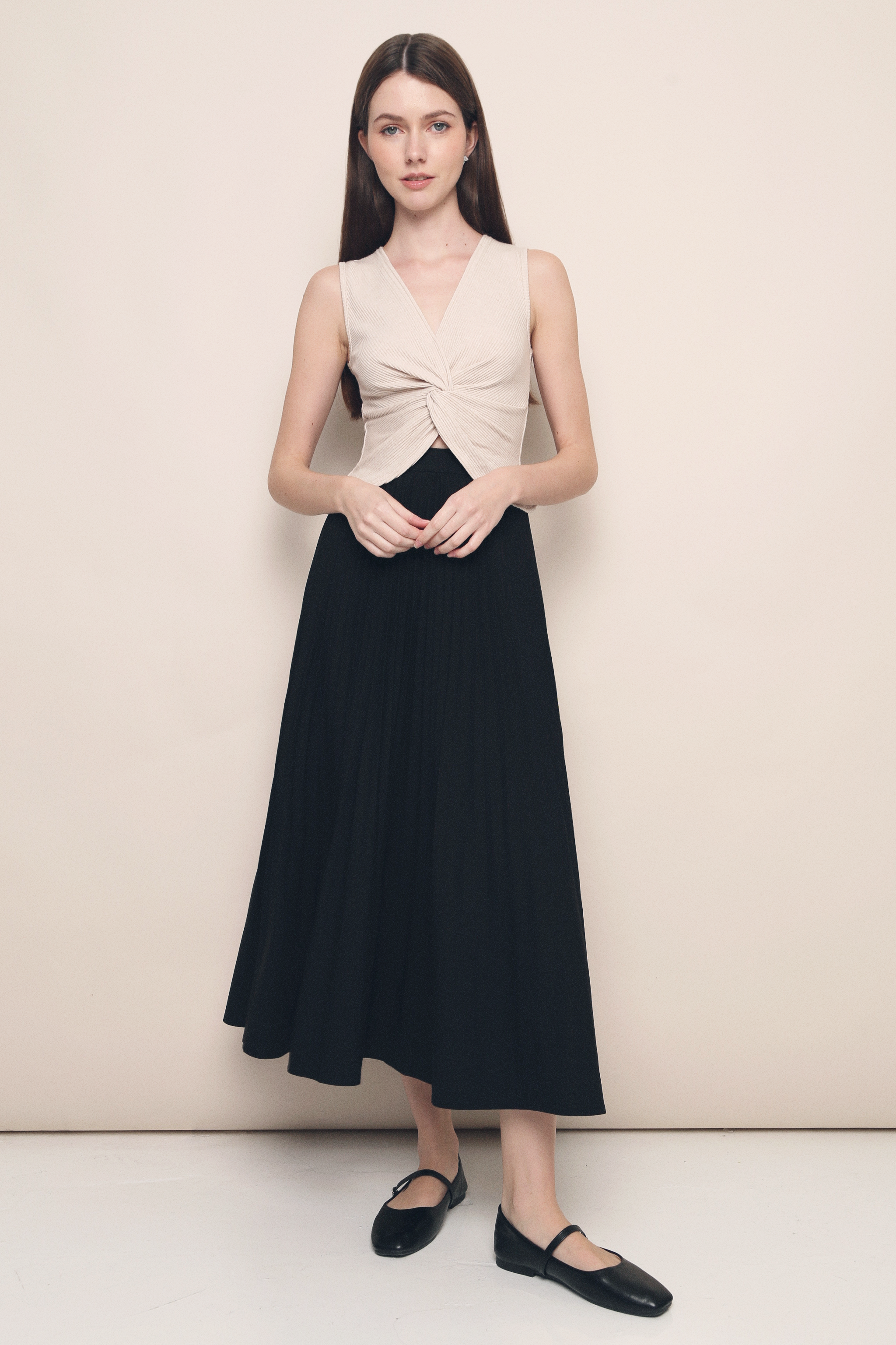 The Daria Twister Top showcases a trendy sleeveless silhouette crafted from ribbed knit material. Its unique twist detail adds a playful touch, making it a versatile piece for effortless style on sunny days. Perfect for layering or wearing solo!