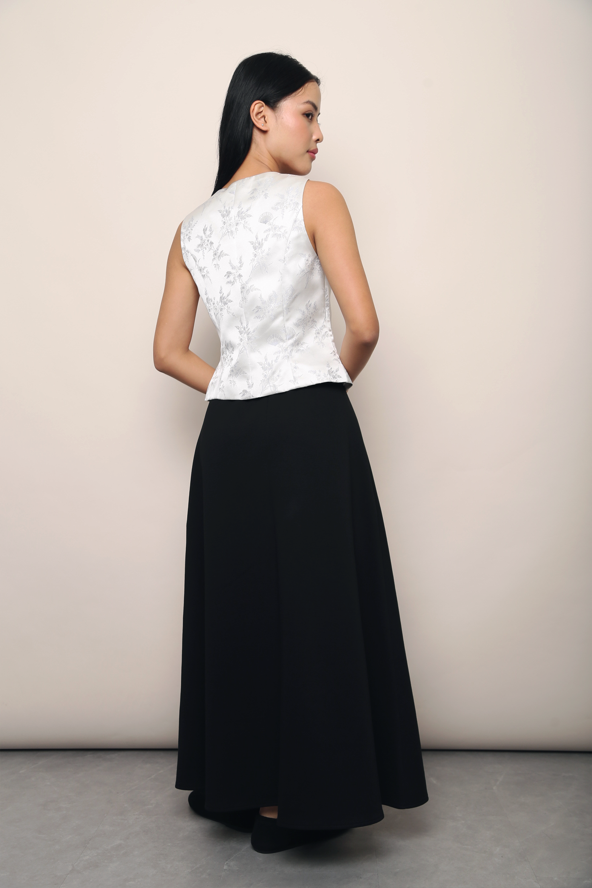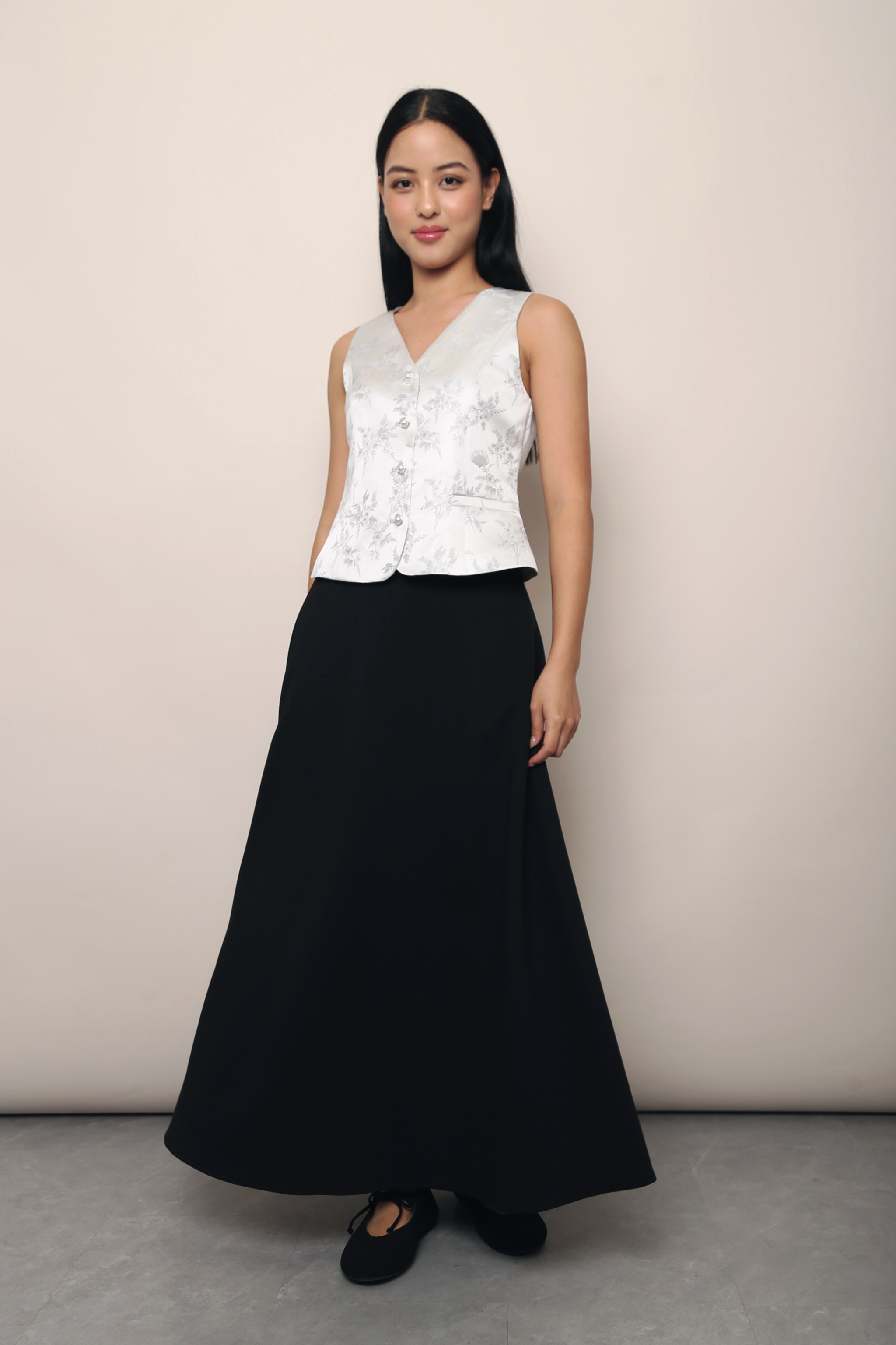 This sleeveless vest is crafted from textured jacquard fabric featuring a subtle floral pattern for an elevated, refined look. Designed with a flattering V-neckline and a tailored silhouette, it fastens with front buttons to create a clean, structured finish. Lightweight yet polished, it can be worn on its own or layered effortlessly, making it a versatile piece for both casual and dressier styling.