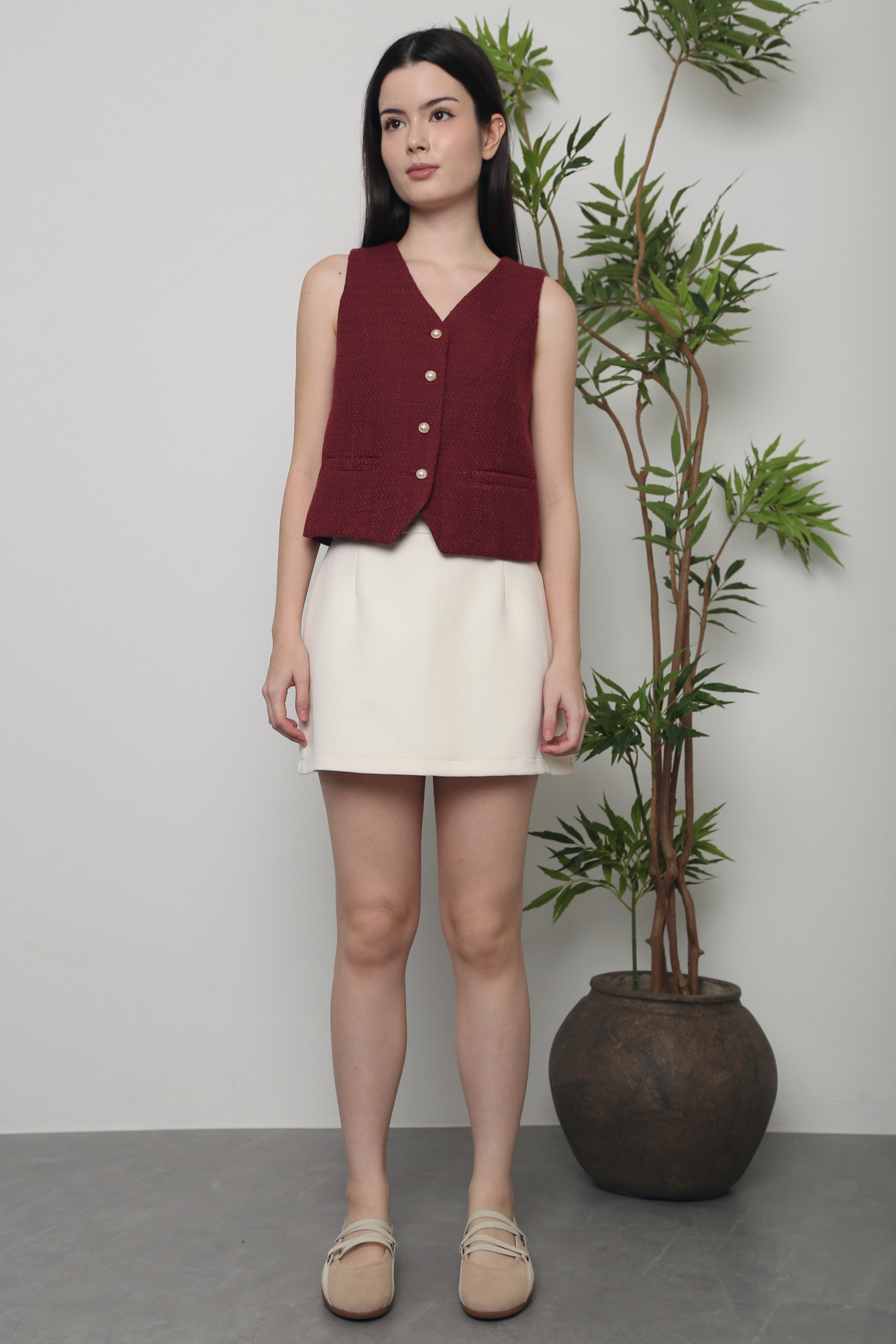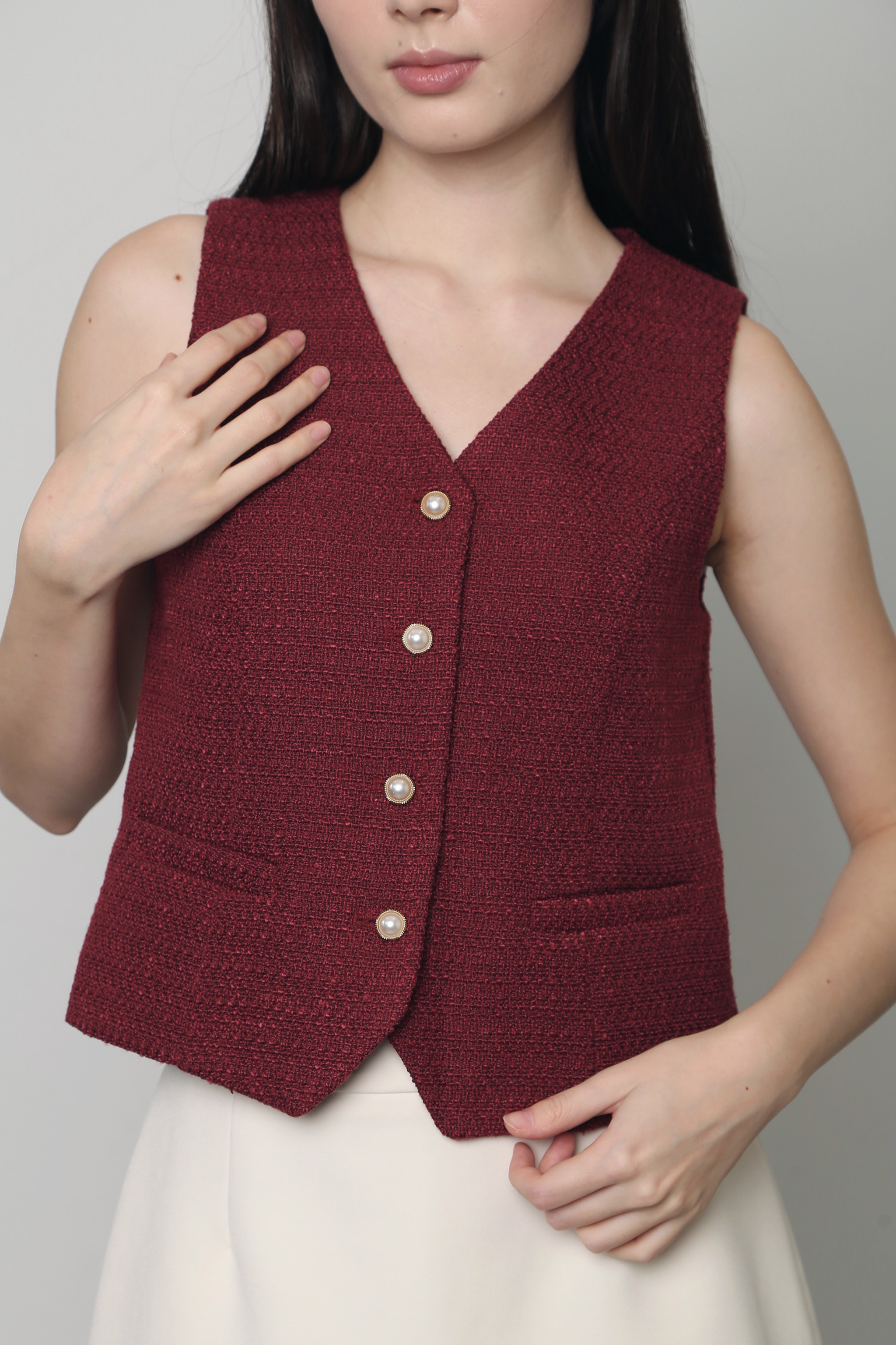 A chic tweed vest designed with a structured yet lightweight feel, fully lined for comfort. Finished with functional front buttons and subtle pocket details, it’s perfect for adding a polished touch to both casual and dressed-up looks.