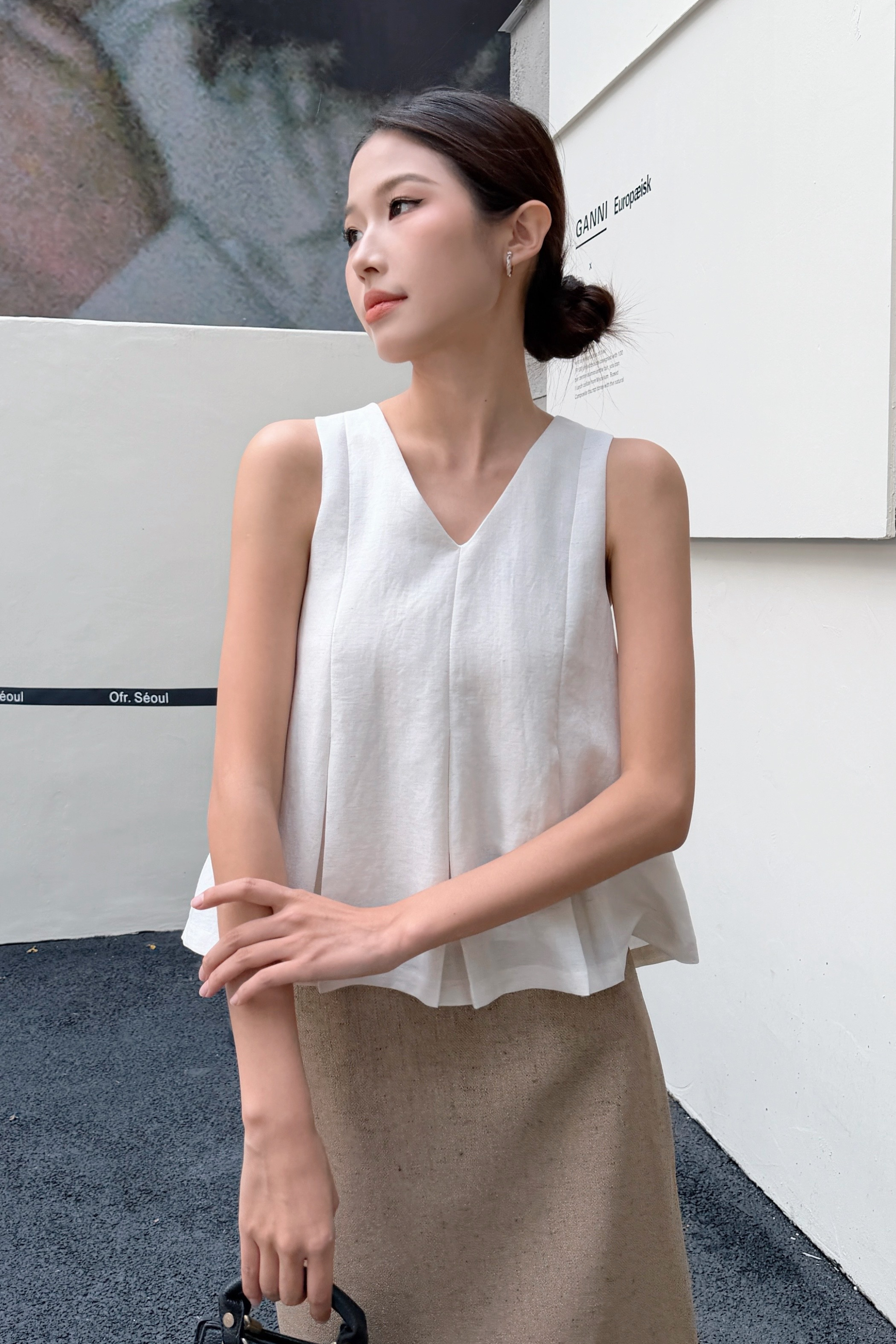 A breezy, feminine blouse featuring a clean V neckline and soft front pleats that create a flattering, flowy silhouette. Crafted from a comfortable cotton–linen blend and fully lined for a smooth finish, with a concealed back zipper for easy wear. Perfect for casual outings, workdays, or styled up for weekend brunch.