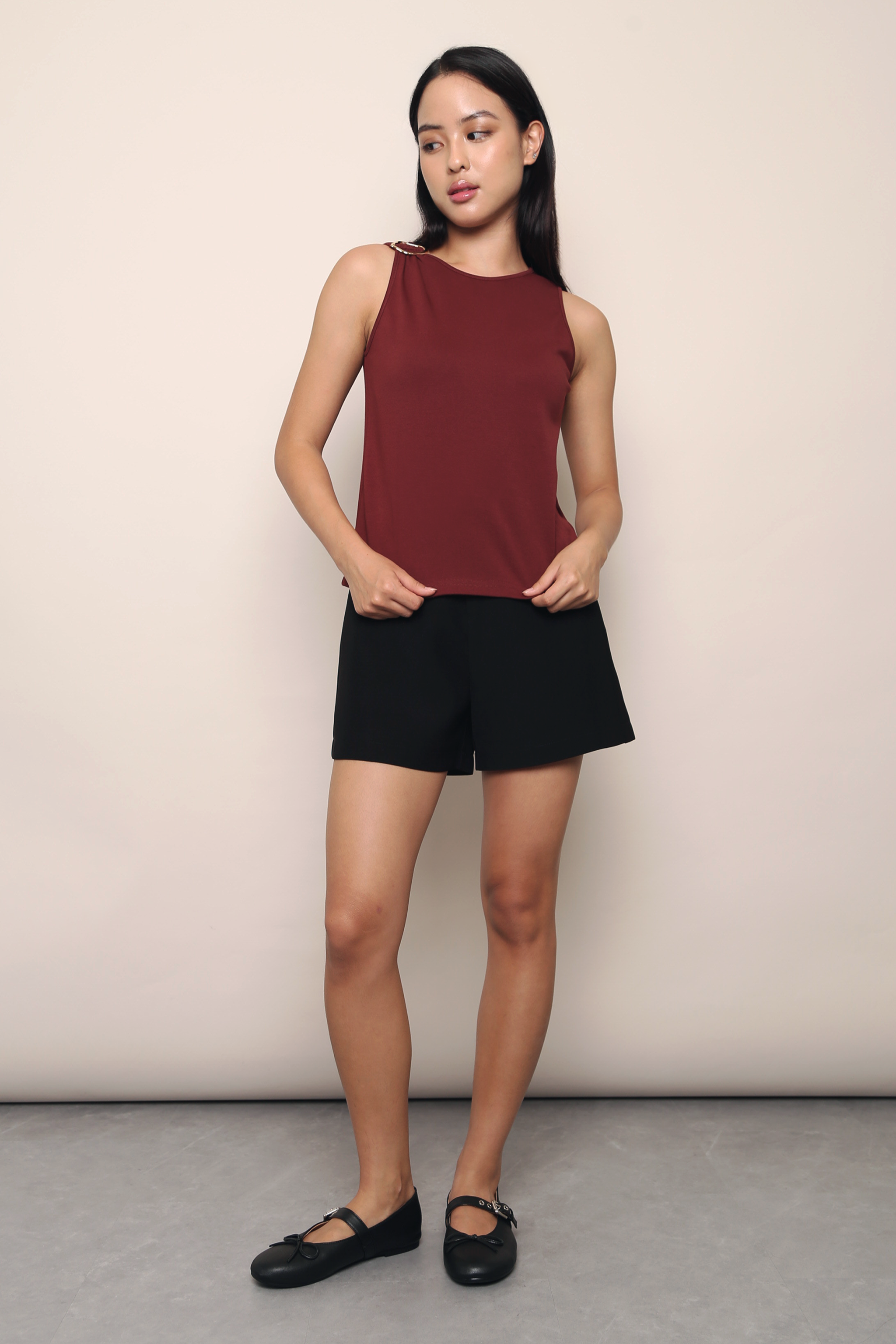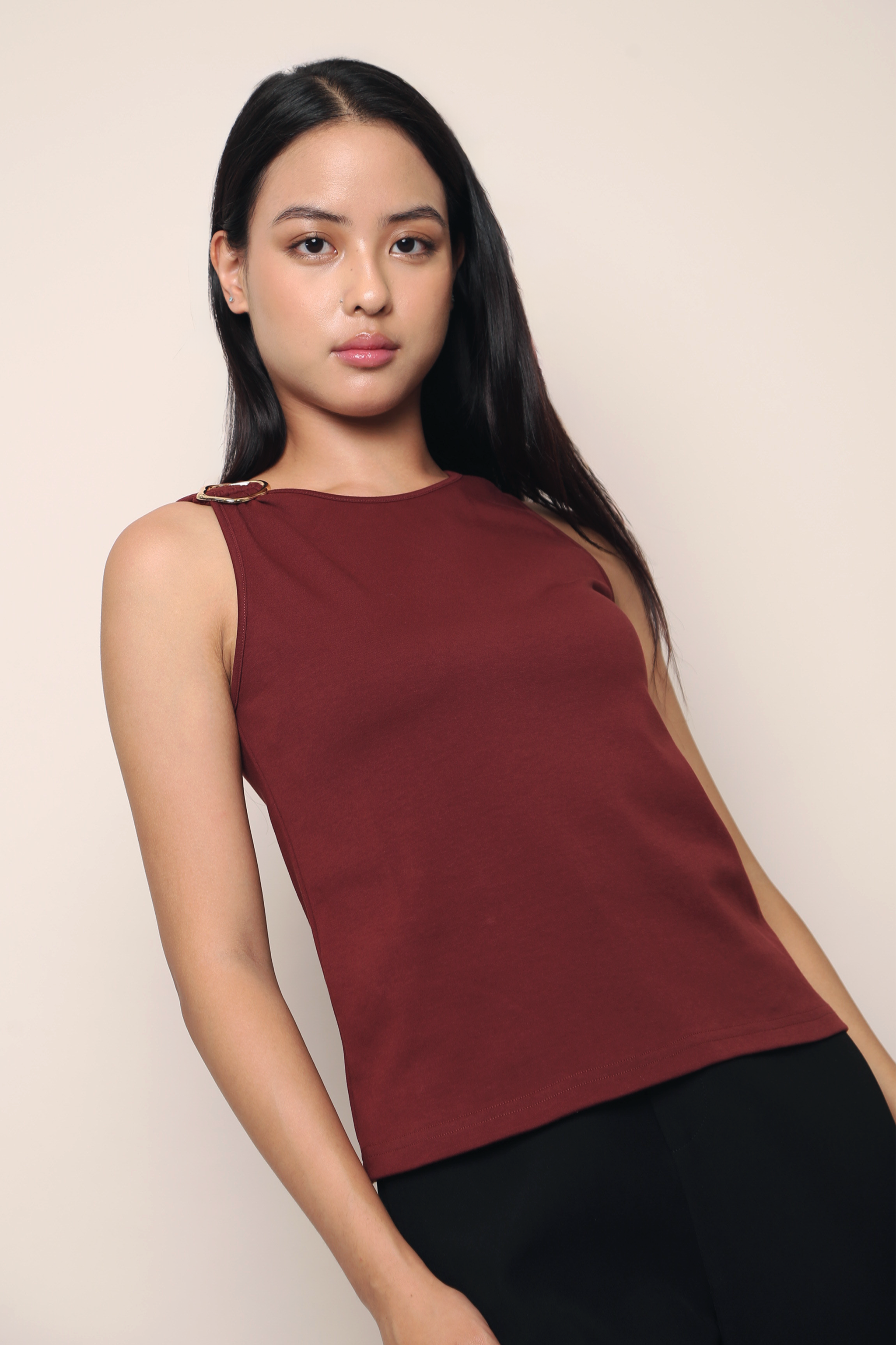 A sleek sleeveless top accented with a statement buckle detail on one shoulder for a modern, elevated touch. Designed with a clean, structured silhouette that’s easy to style, it’s perfect for CNY gatherings, office days, dinner dates, and nights out when you want to look polished with minimal effort.
