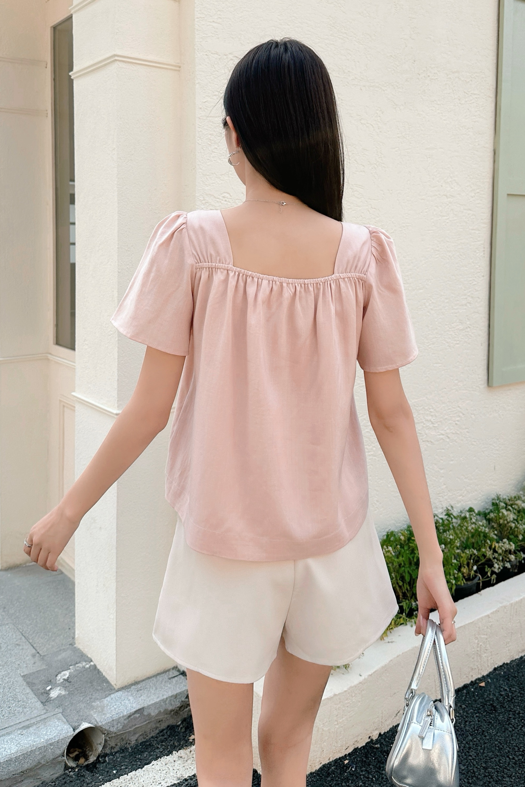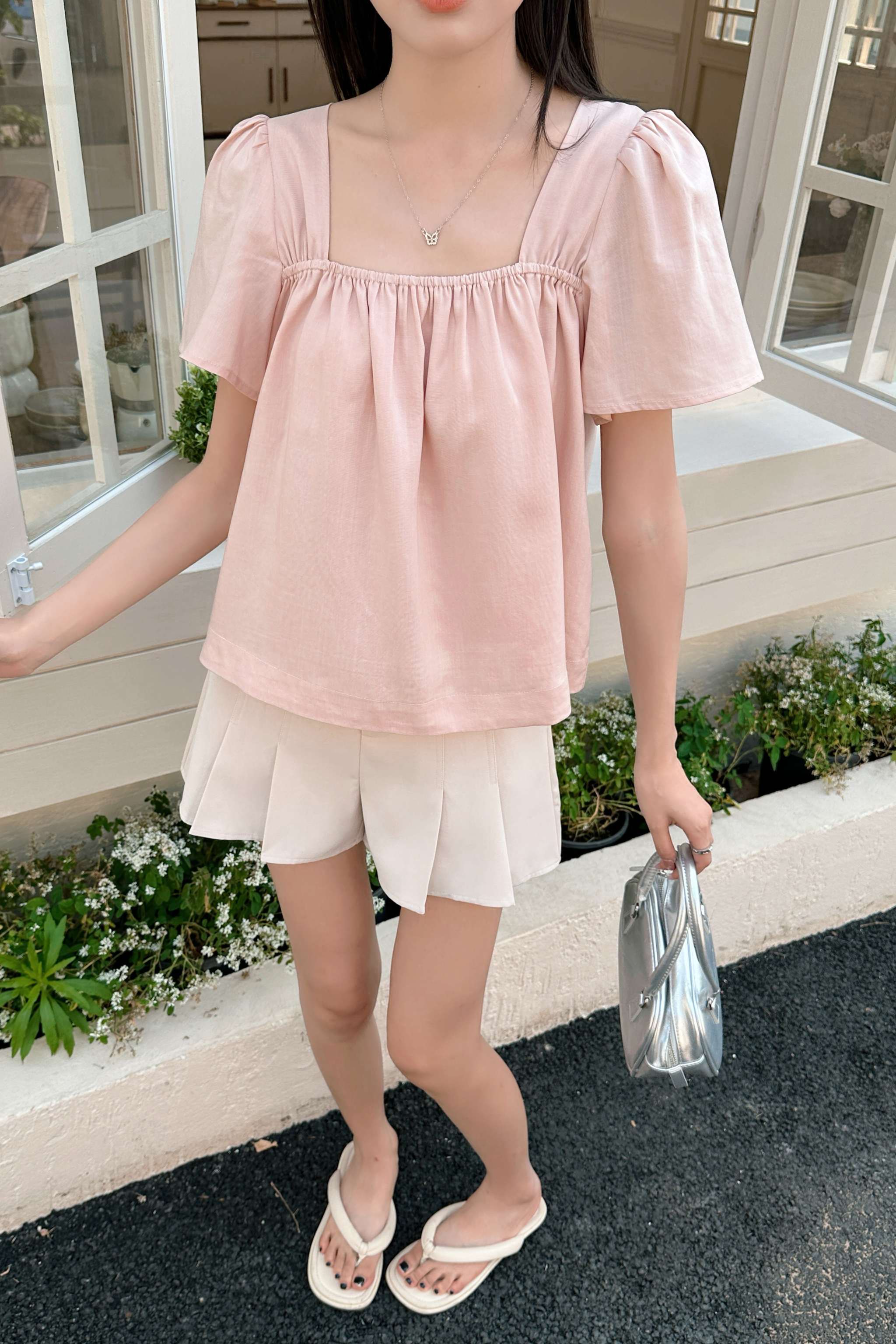 A soft, feminine blouse designed for effortless everyday style. This top features a flattering square neckline with gentle gathers at the bust and airy puff sleeves for a romantic touch. The relaxed silhouette drapes comfortably, making it perfect for warm weather and easy layering. Dress it up with tailored pants or keep it casual with denim.