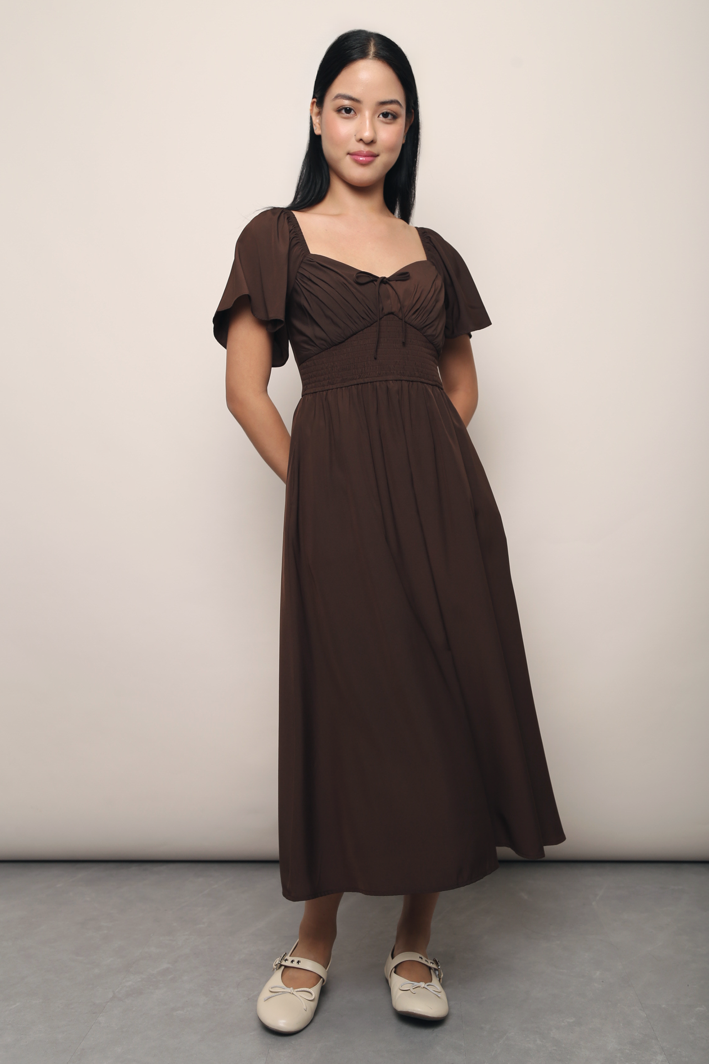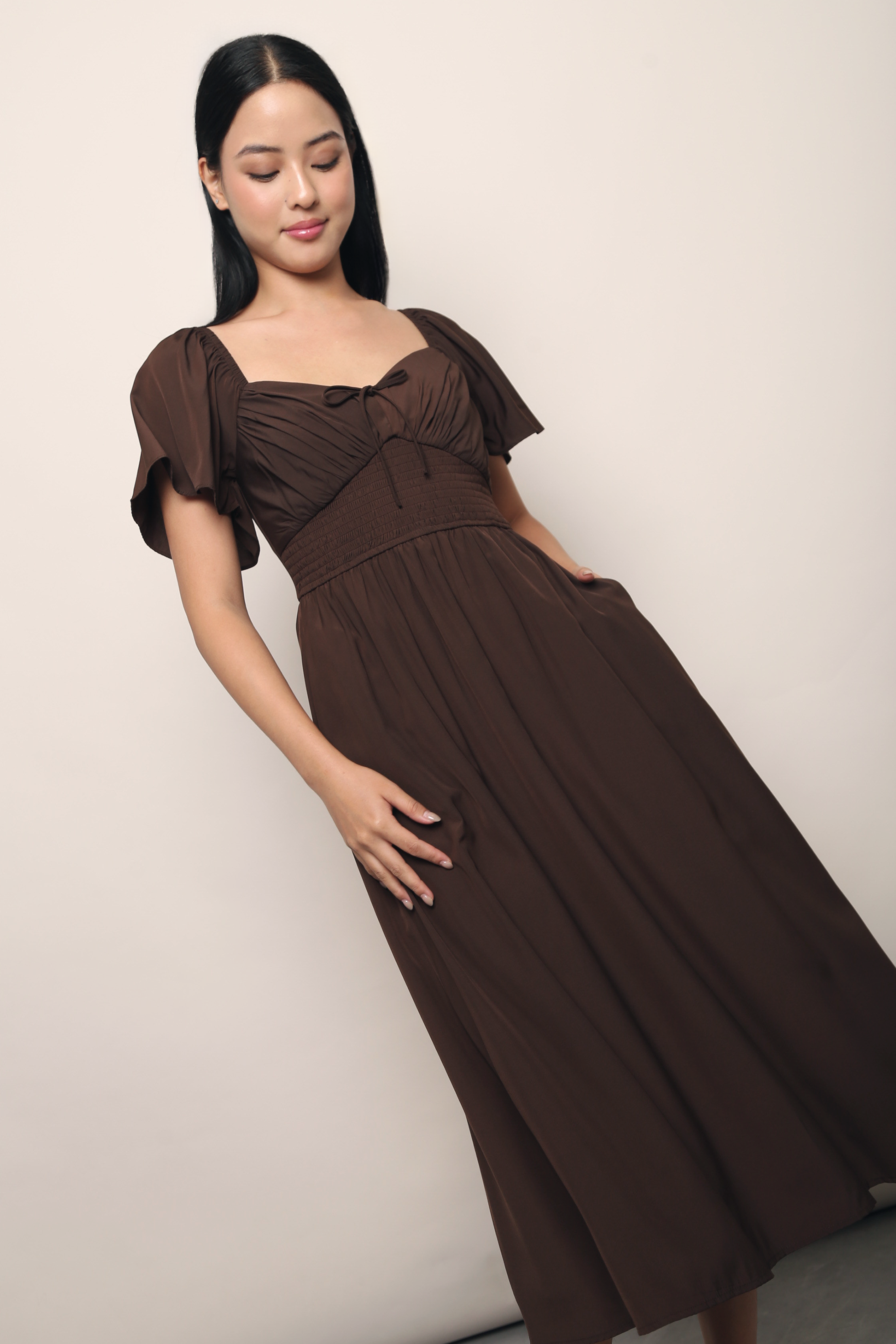 Low-key flattering with a clean, feminine edge. This dress features a softly smocked waist for an easy cinch, a subtle sweetheart neckline with a front-tie detail, and relaxed flutter sleeves. Polished but never fussy — The kind of piece you throw on and instantly look put together