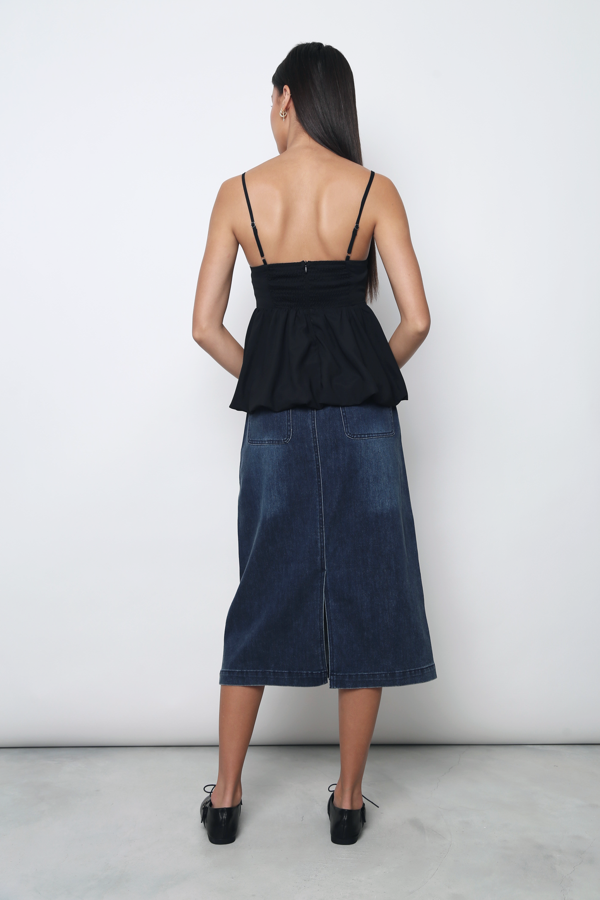 A fully lined, fitted bodice top featuring a close, corset-inspired structure. The upper section showcases vertical pleats that create an intentional tecture and tailored feel. Below the bust, the fabric flares out into a voluminous, gathered hemline, delivering a distinct bubble or peplum silhouette. This lightweight piece is designed for a flattering, elevated fit that can be worn for a picnic or a simple day out.