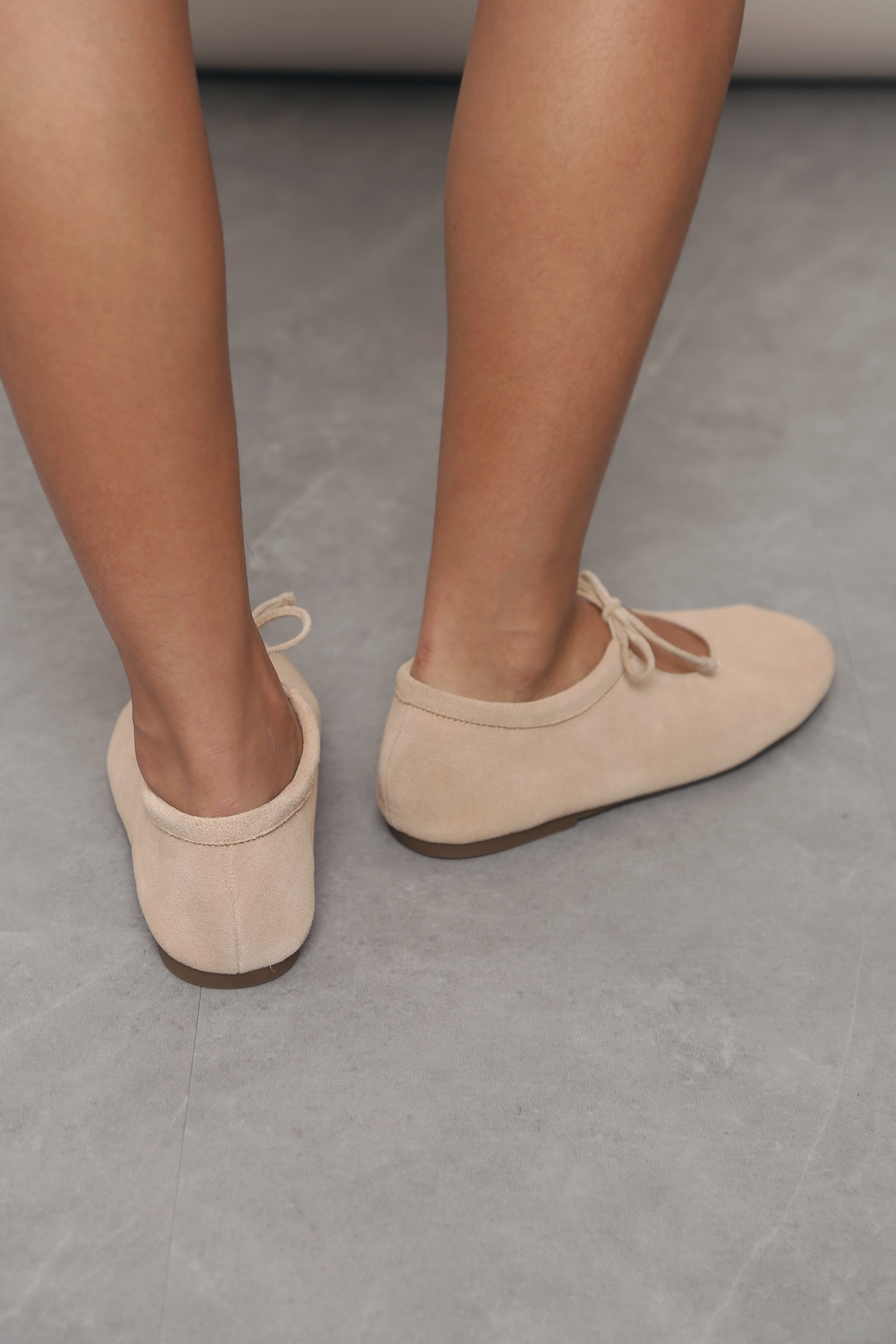 Crafted from soft top-grain suede leather, these ballet flats feature a delicate adjustable tie for a graceful, feminine touch. Lightweight and easy to wear, they offer all-day comfort while adding an effortlessly charming and subtly romantic accent to any outfit, perfect for both casual strolls and special occasions.