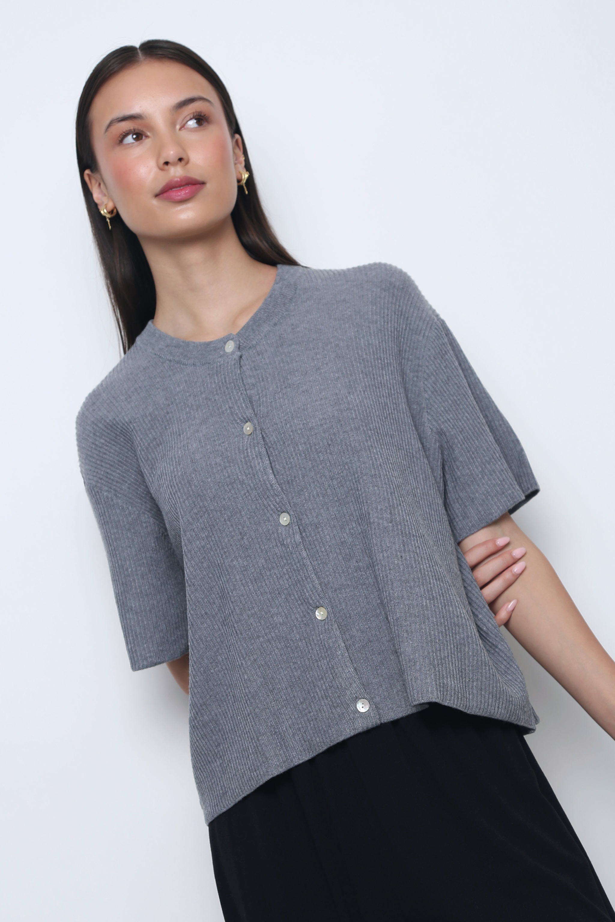Soft, breathable cotton-blend knit meets effortless style. Featuring functional front buttons, this short-sleeved top is perfect for layering or wearing on its own. Easy, versatile, and comfortably chic.