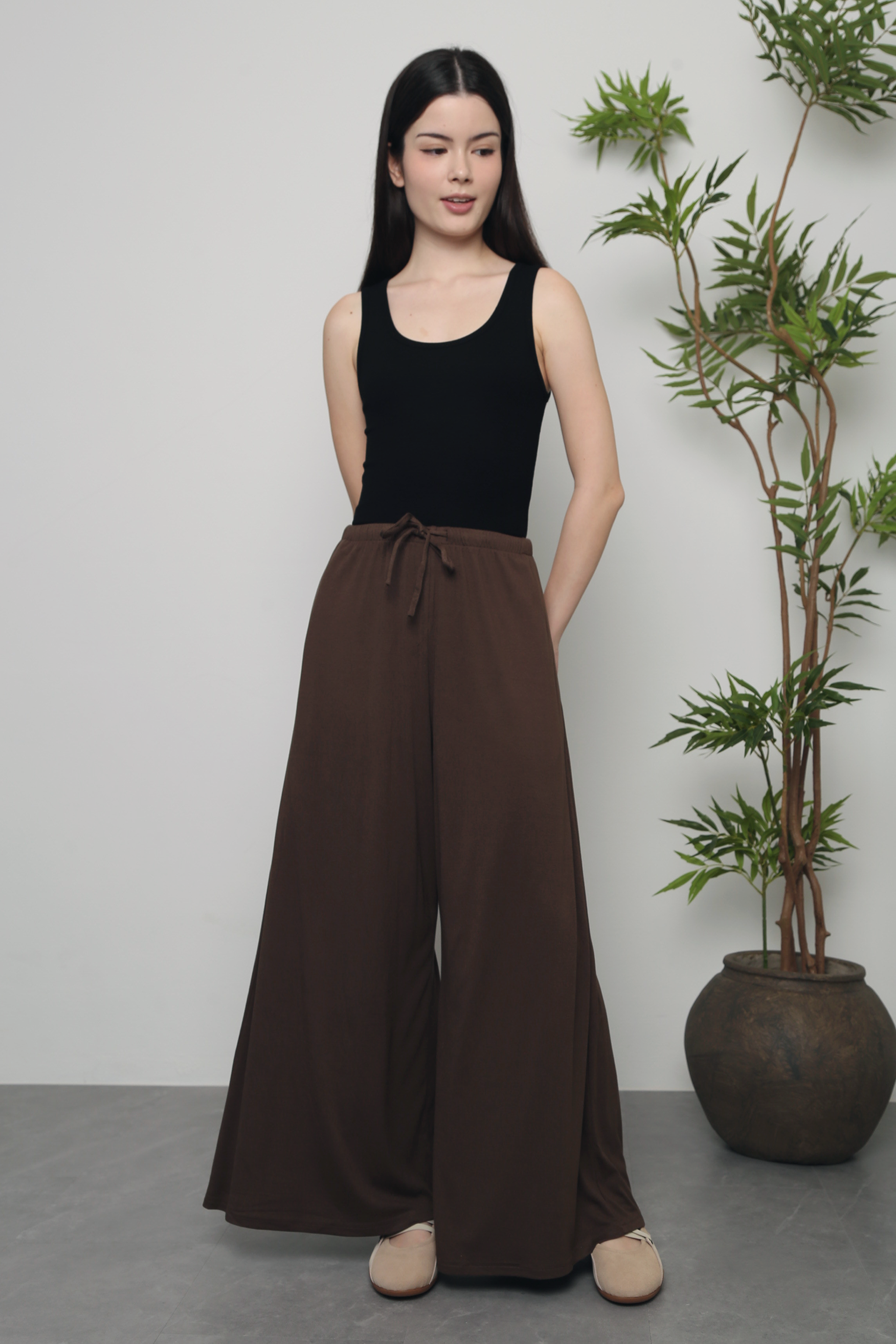 A flowy, easygoing pair of palazzo pants that offer all-day comfort with a relaxed, airy silhouette. Perfect for casual outings, weekend errands, or laid-back office days. Pair them effortlessly with a simple tee, a fitted blouse, or a lightweight cardigan for a polished yet comfortable look.