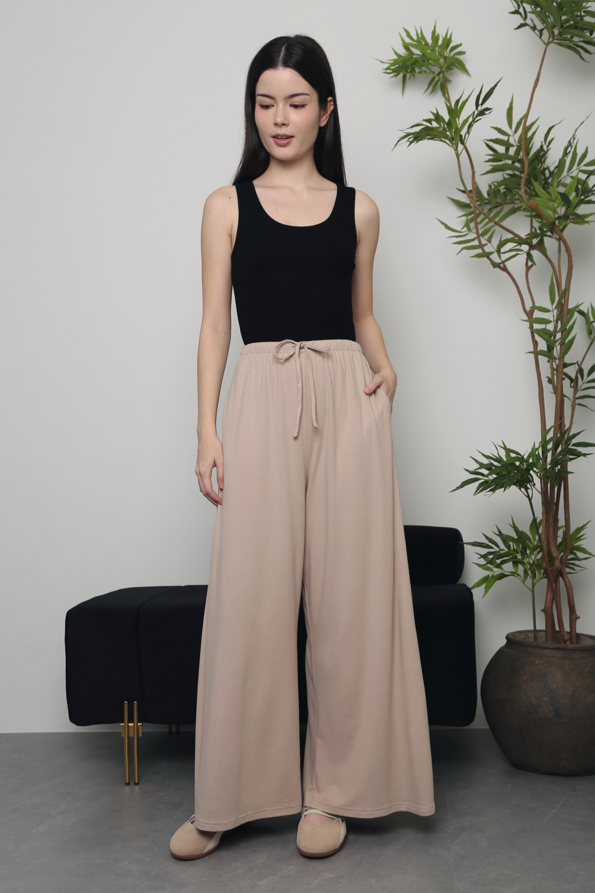 A flowy, easygoing pair of palazzo pants that offer all-day comfort with a relaxed, airy silhouette. Perfect for casual outings, weekend errands, or laid-back office days. Pair them effortlessly with a simple tee, a fitted blouse, or a lightweight cardigan for a polished yet comfortable look.