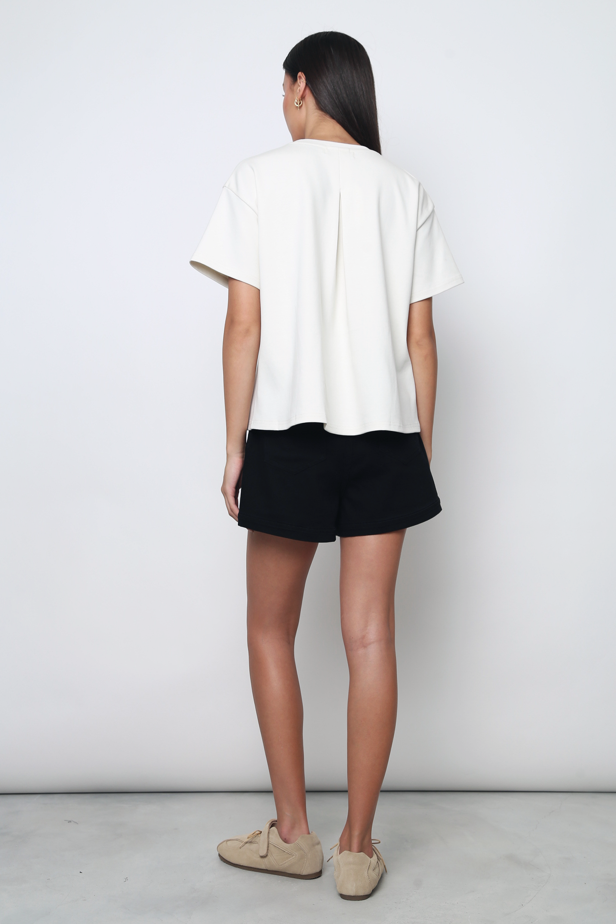 A relaxed essential with a playful twist. Crafted from quality weighted cotton, this tee drapes effortlessly in a subtly flared silhouette for a flattering, easygoing fit. Perfect for casual days, it pairs seamlessly with any bottoms for a laid-back yet polished look.