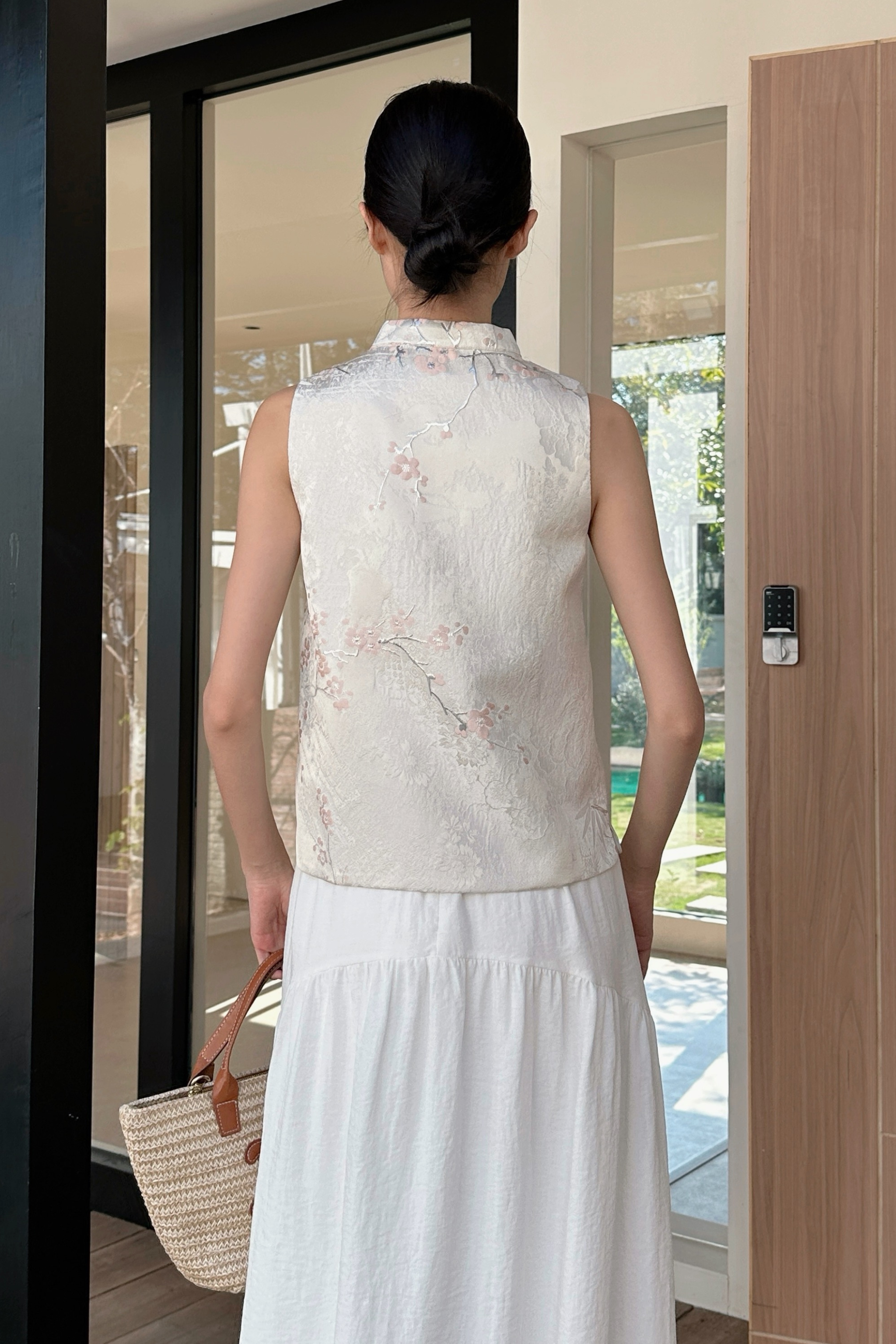A sophisticated piece inspired by classic oriental charm. This sleeveless blouse features a structured silhouette with delicate floral motifs that add a touch of artistry to your look. Fully lined for comfort and finished with functional front buttons, it’s perfect for elevating both everyday outfits and special-occasion ensembles.